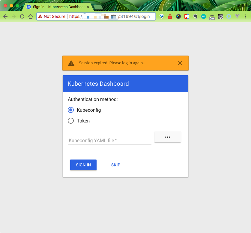 然后直接访问集群中的任何一个节点IP 加上上面的31694端口即可打开dashboard页面了